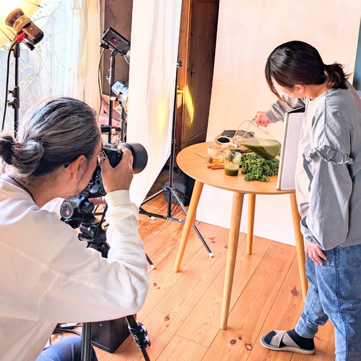 今回の撮影では、新鮮なケールや素材を背景に配置し、商品の持つ“健康的なイメージ”を最大限に引き出すことを意識しました。特に青汁をグラスに注ぐ瞬間を切り取ることで、みずみずしさや美味しさが直感的に伝わるビジュアルに仕上げました。